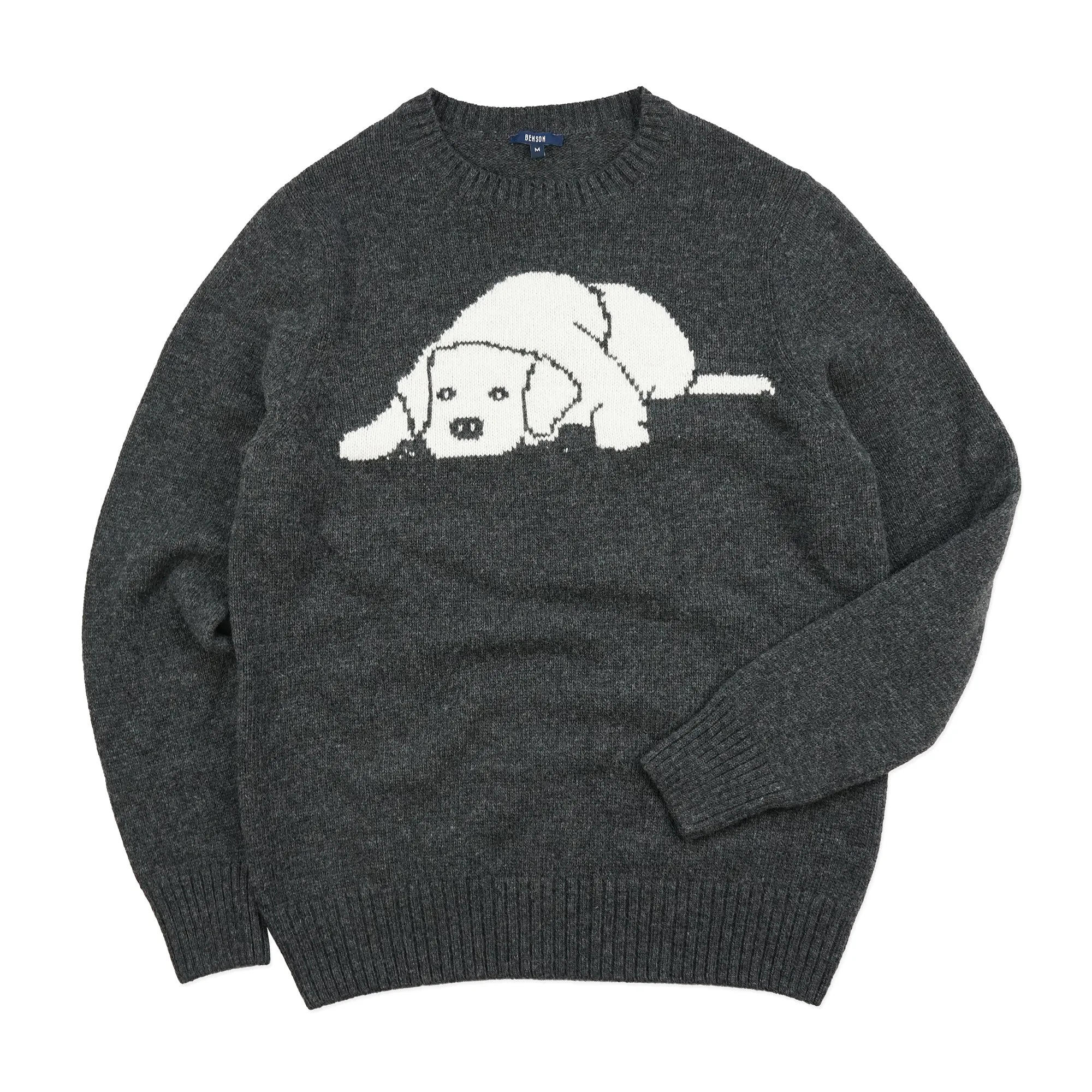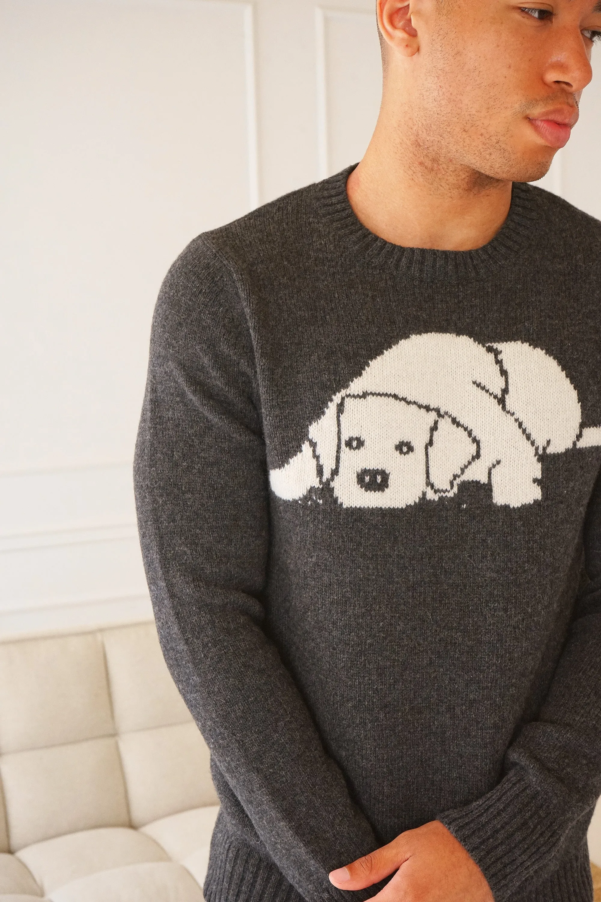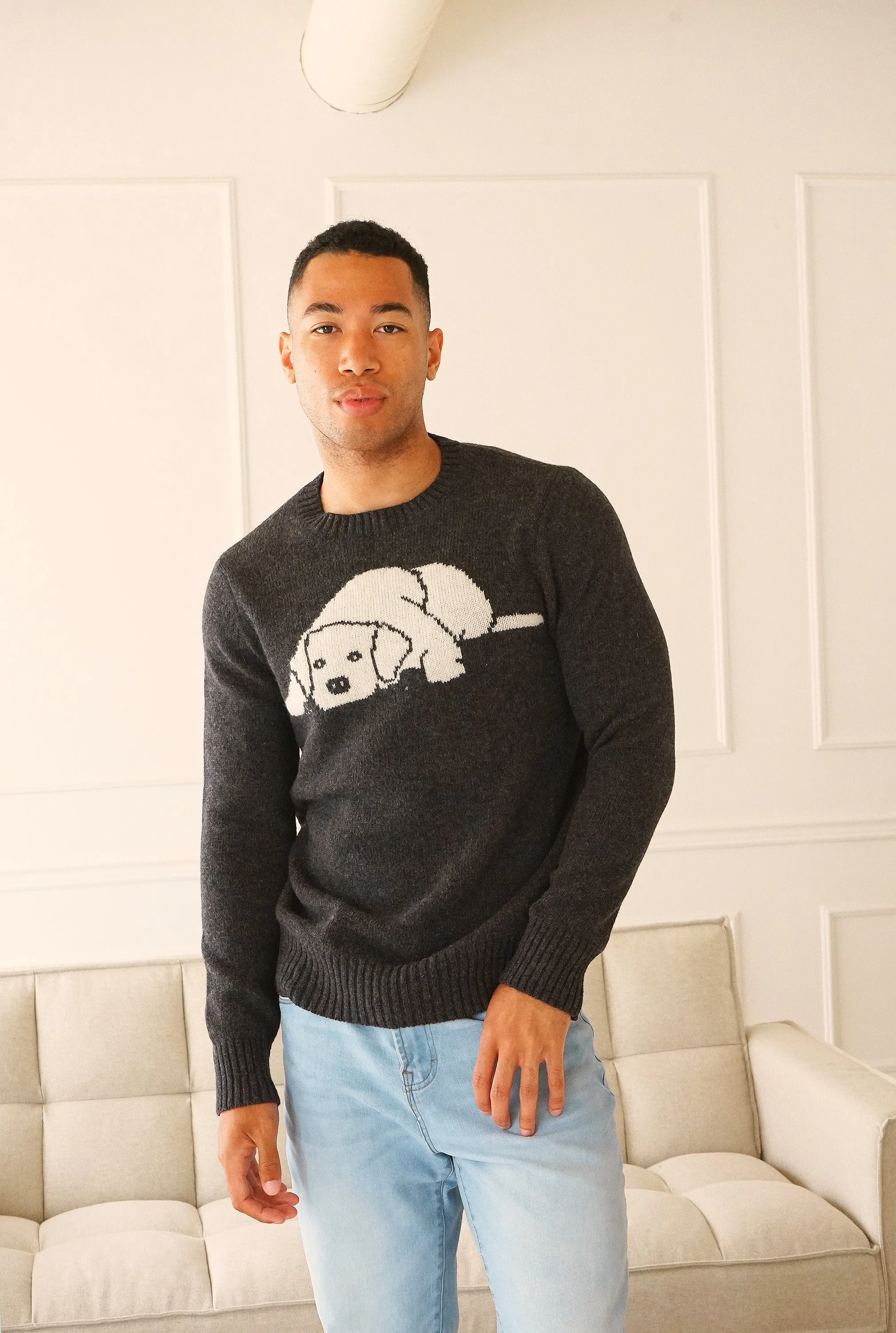 Who doesn't love dogs? A yearly design, this season we're featuring a golden retriever puppy. Upgrade your knit collection with this striking sweater this winter. A soft, lightweight sweater paired back to a pair of trackpants and sneakers for a relaxed look.